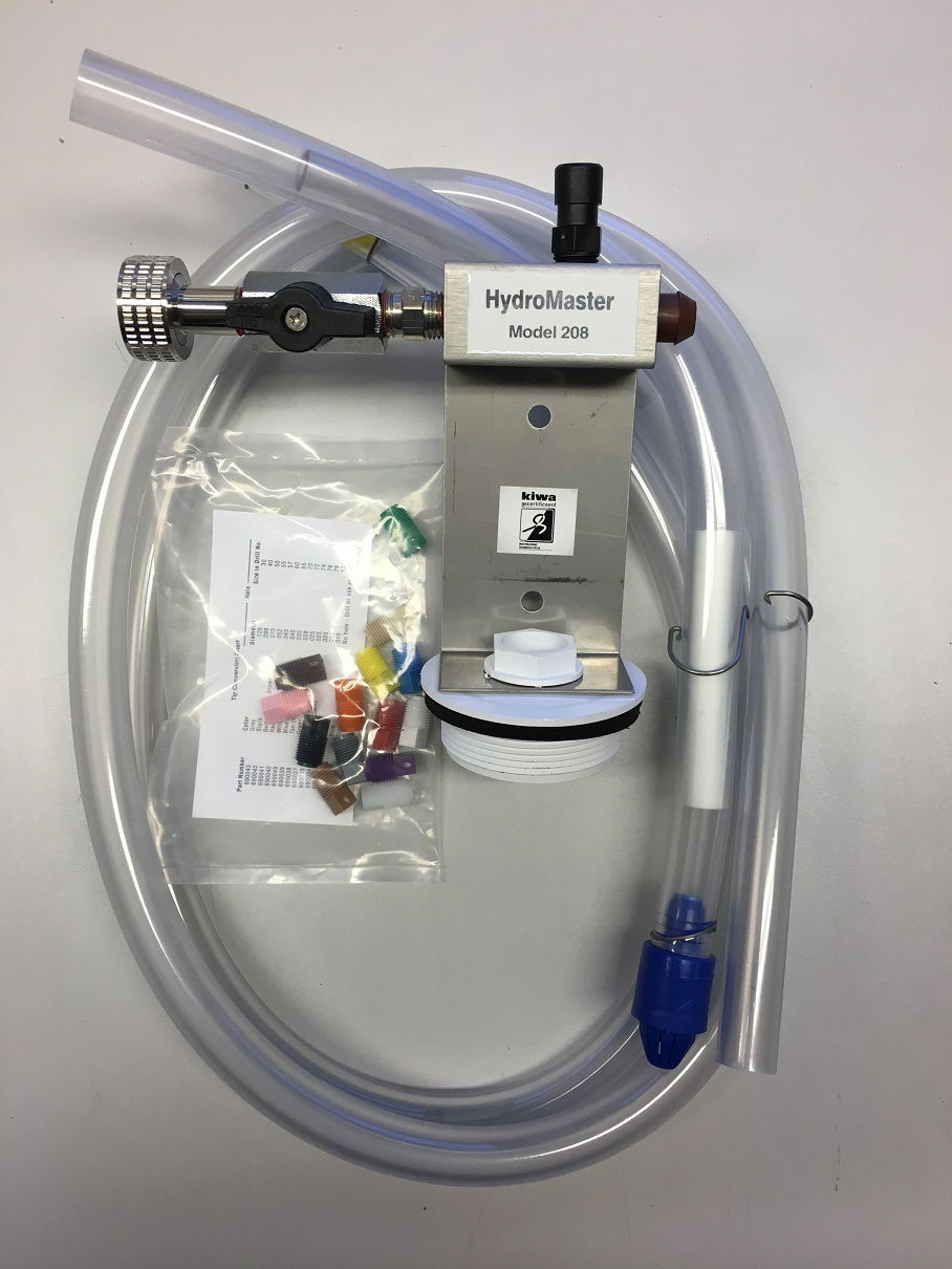 Hydro Master 208GB levereras med ett komplett set av munstycken som justerar blandningsförhållandet från 1:1 till 110:1. “Utan munstycke” ger högsta koncentrationen. Enkel att kalibrera och kontrollera för att uppnå exakt rätt styrka.